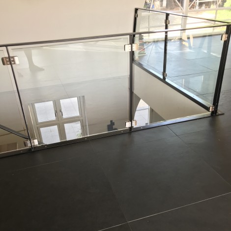 Gelænderet er fremstillet i 50x10 mm fladjern, monteret med en 10 mm lamineret glasplade til afskærmning, samt rustfri glasklemmer. Gelænderet er pulverlakeret sort, hvilket giver en meget slidstærk overflade og flot finish.