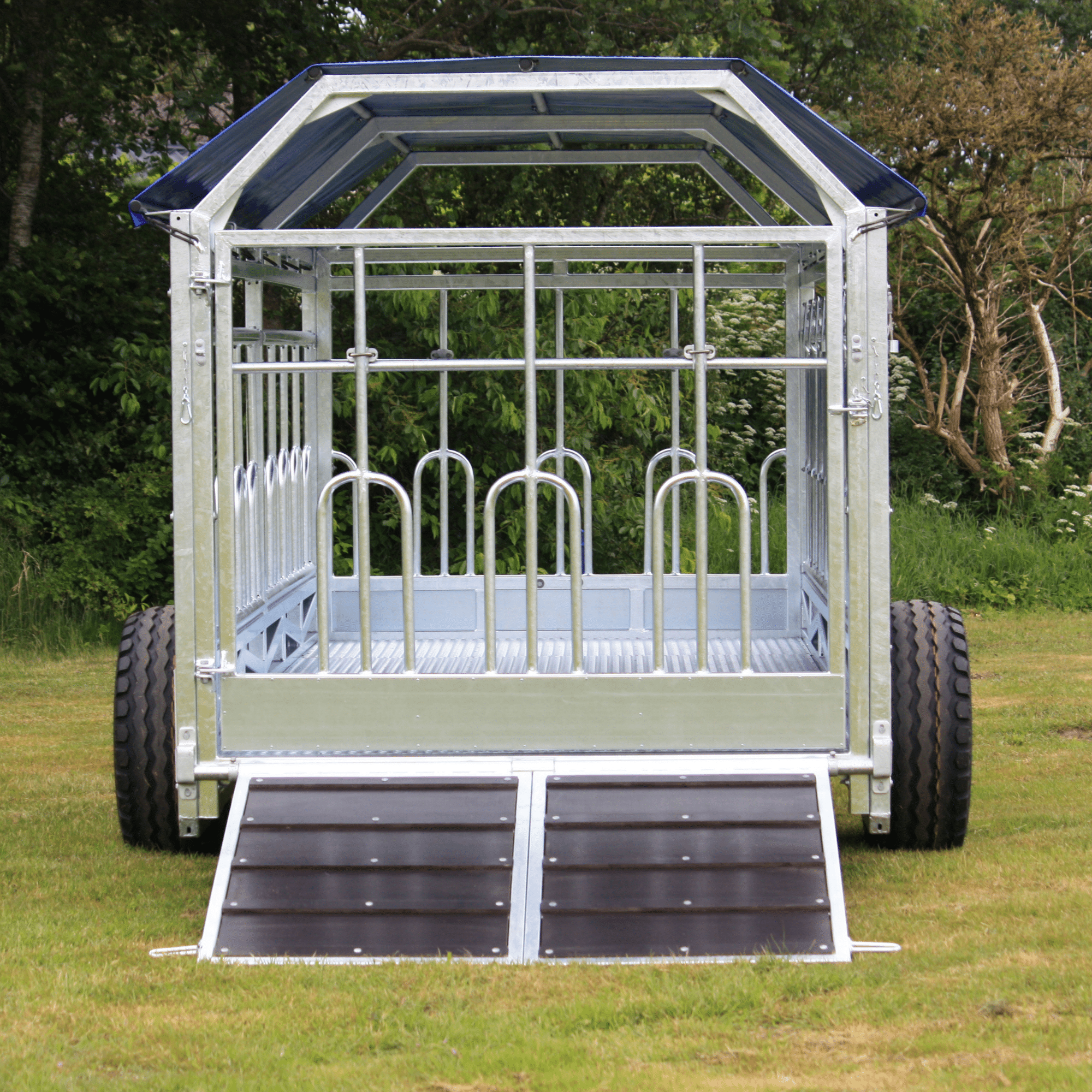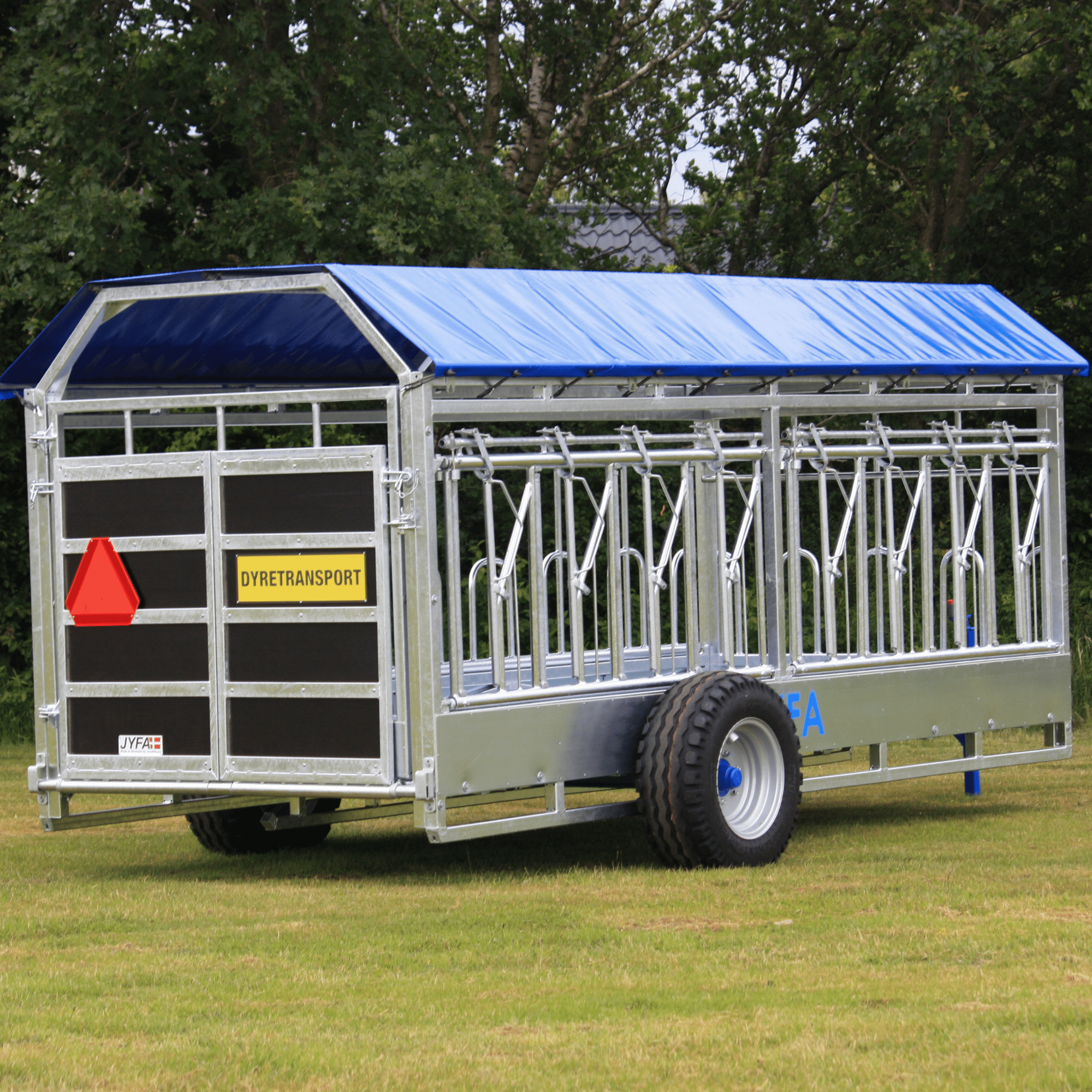 The 5M Combi Trailer (CBV500) is equipped with a large gate at the rear end. The external trailer width, incl. wheels is 2.85 meters, and the total length, incl. drawbar is 6.4 meters. The actual trailer box is 5 meters long, and the inner width is 2 meters. This gives you a total floor space of 9.8 m2 (2m x 4.9m), allowing you to carry approx. 6-8 animals, according to Danish area requirements.