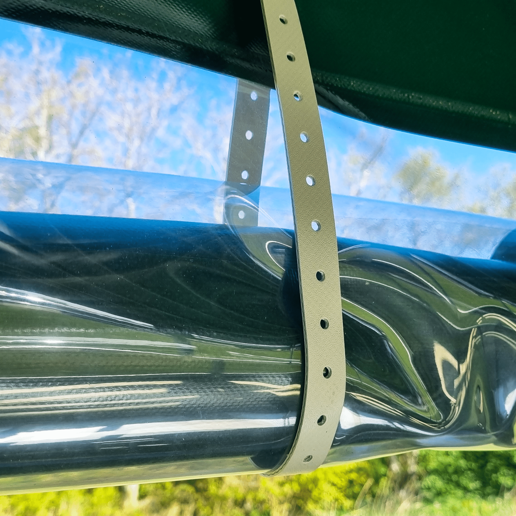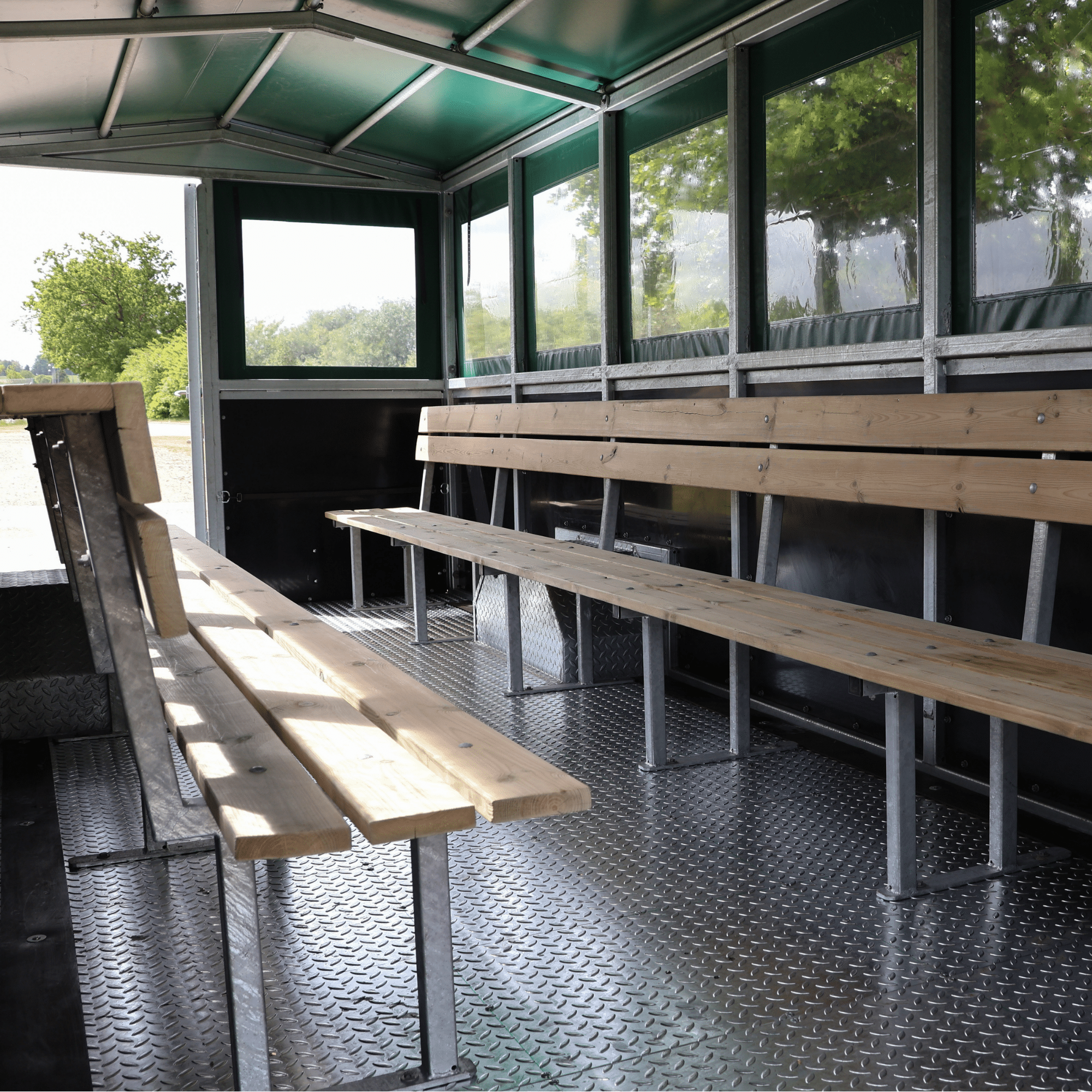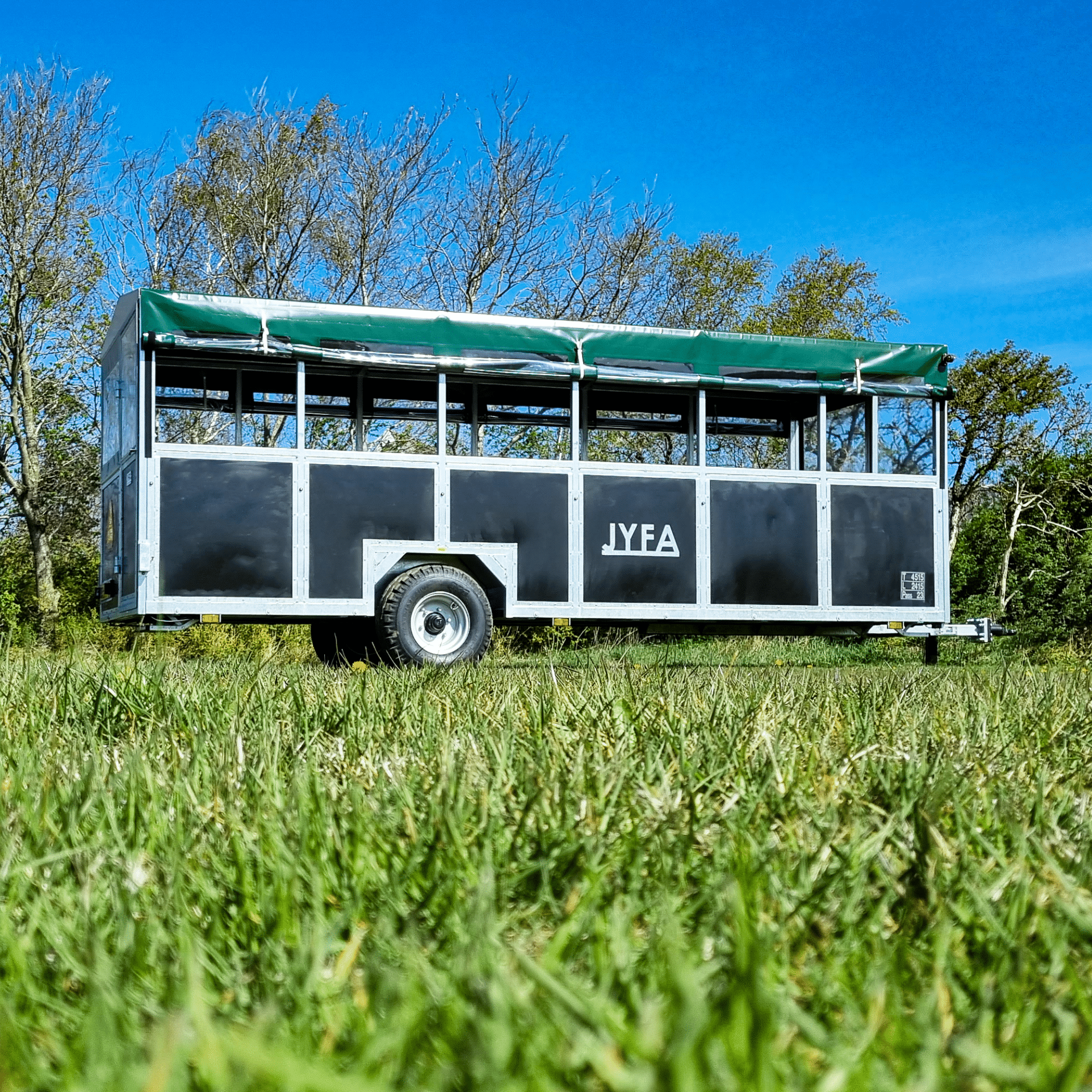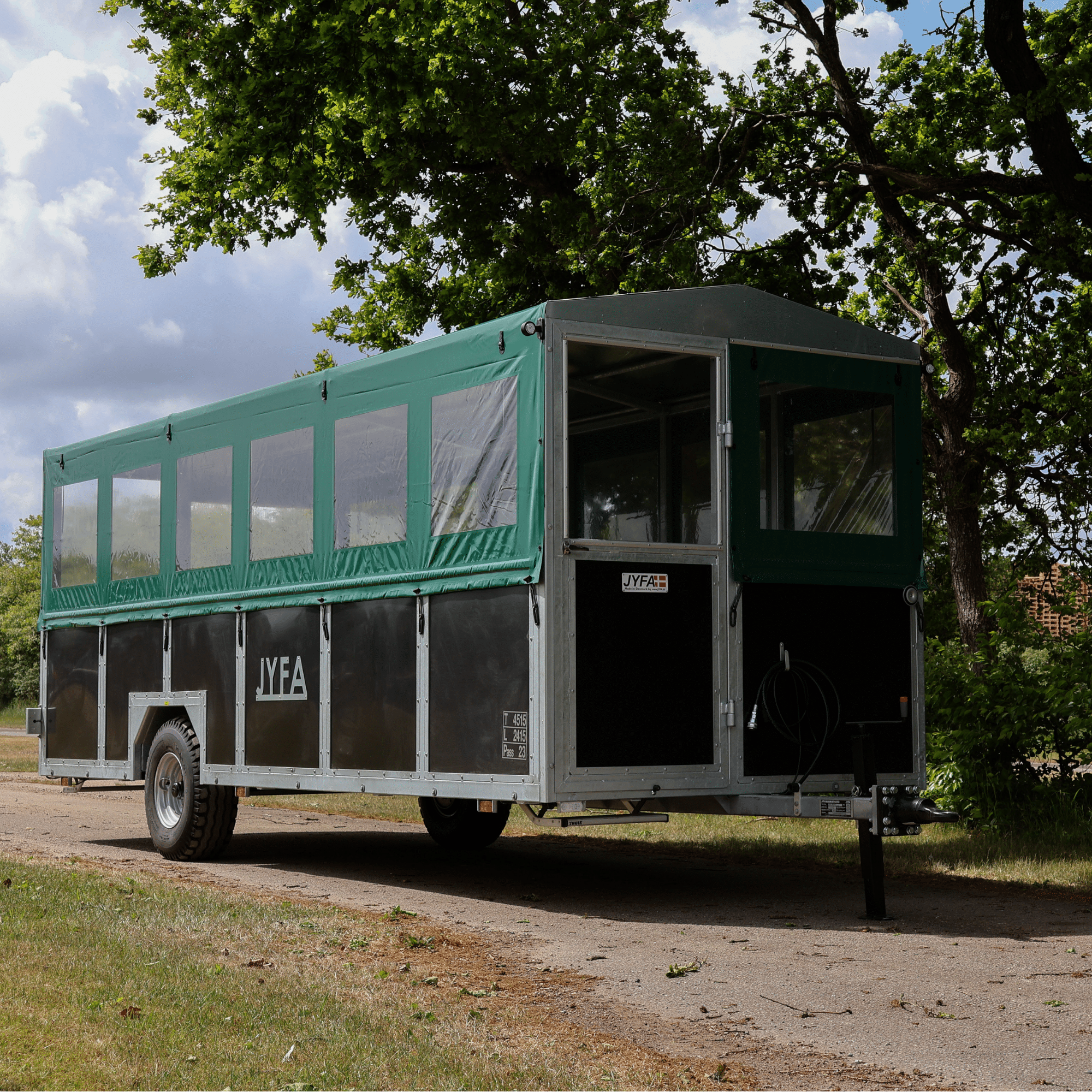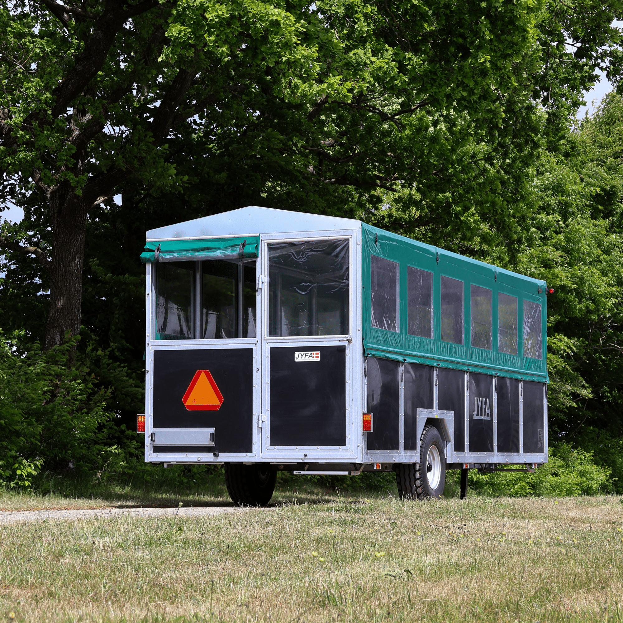 The trailer is fitted with a door at both the rear and the front. The roof, as well as the sides, are equipped with green tarpaulin to blend in naturally with the surroundings. Furthermore, the trailer is designed with transparent plastic windows on all sides, allowing the passengers to enjoy the surroundings during the trip. The trailer is equipped with individual roll-up sides on each side. You can roll up the front and back at the same time, to create a good airflow in the trailer whilst driving.