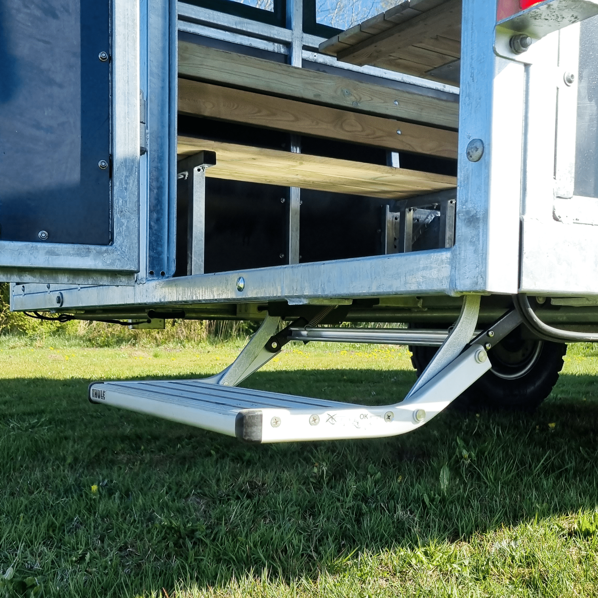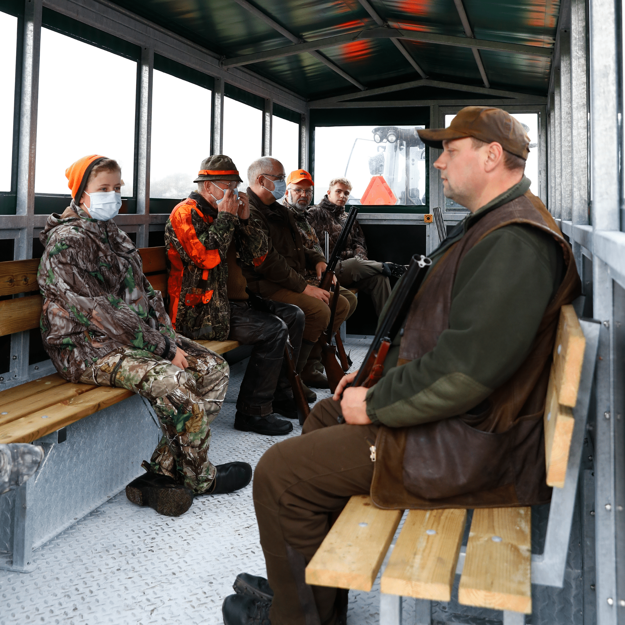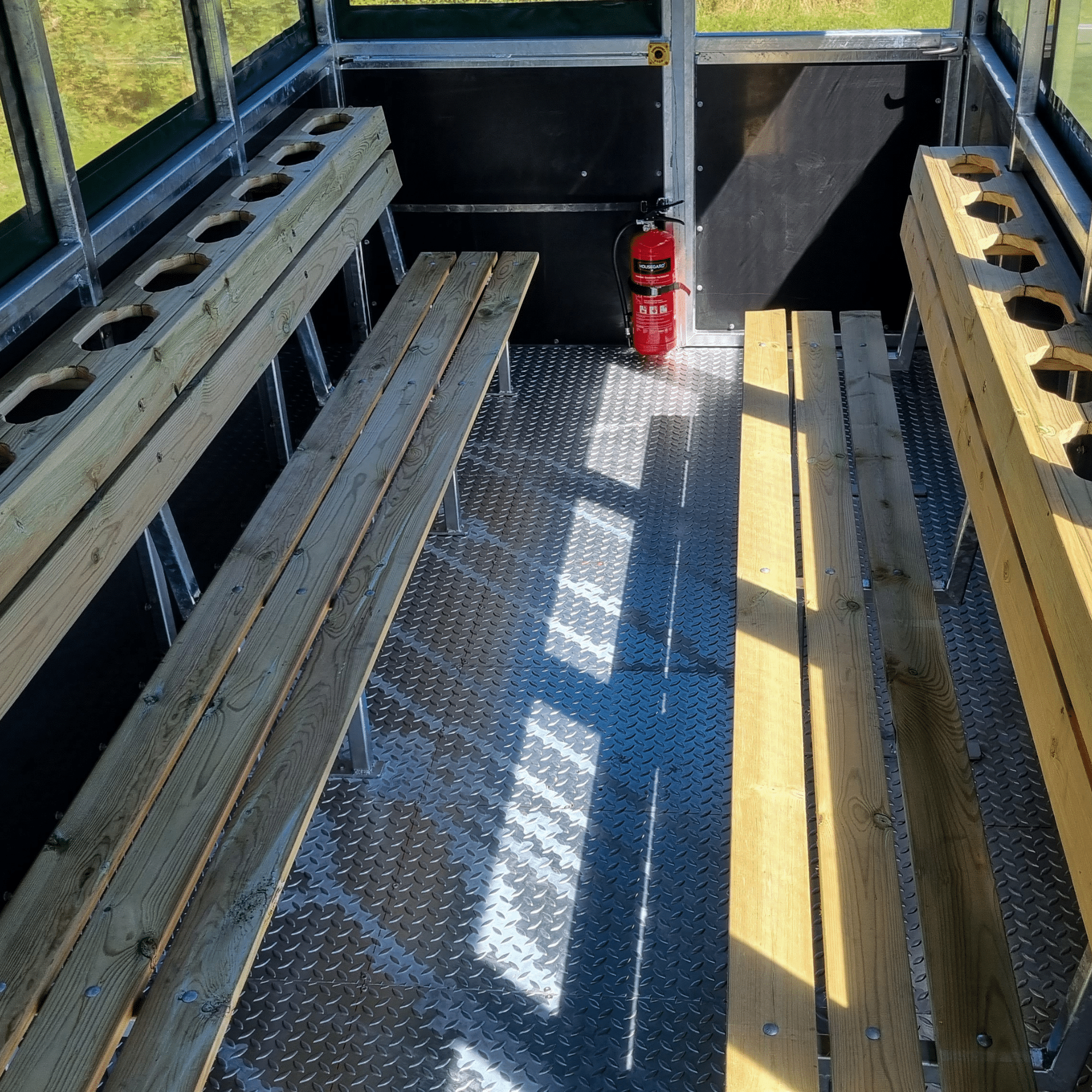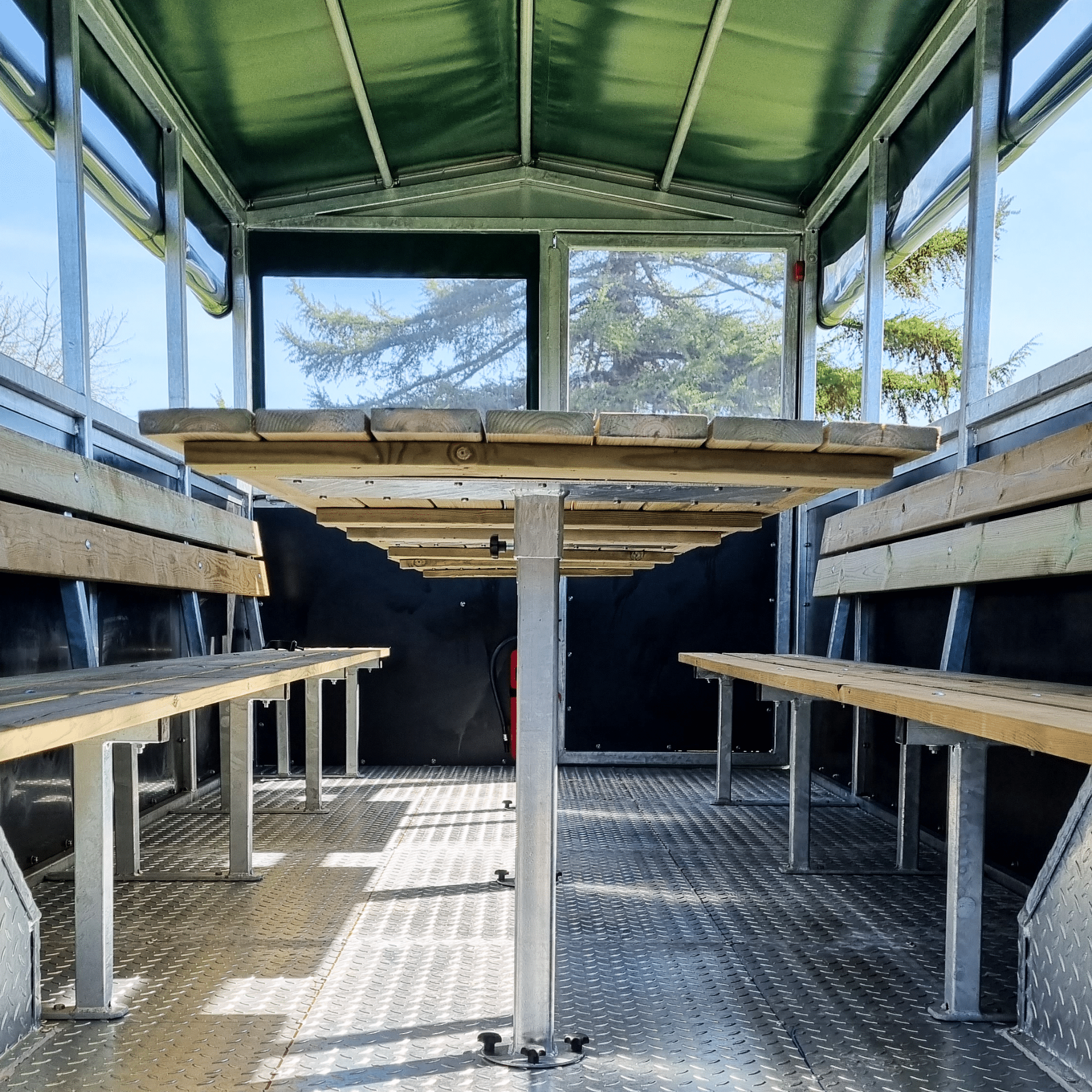 As an extra comfort feature, the trailer can be equipped with up to 4 tables, allowing passengers to enjoy a cup of coffee or a packed lunch along the way. The tables are easy to mount and dismount, and when not in use, they can be conveniently stored at each end of the trailer to save space. This makes the trailer a highly flexible sightseeing trailer and hunting trailer.