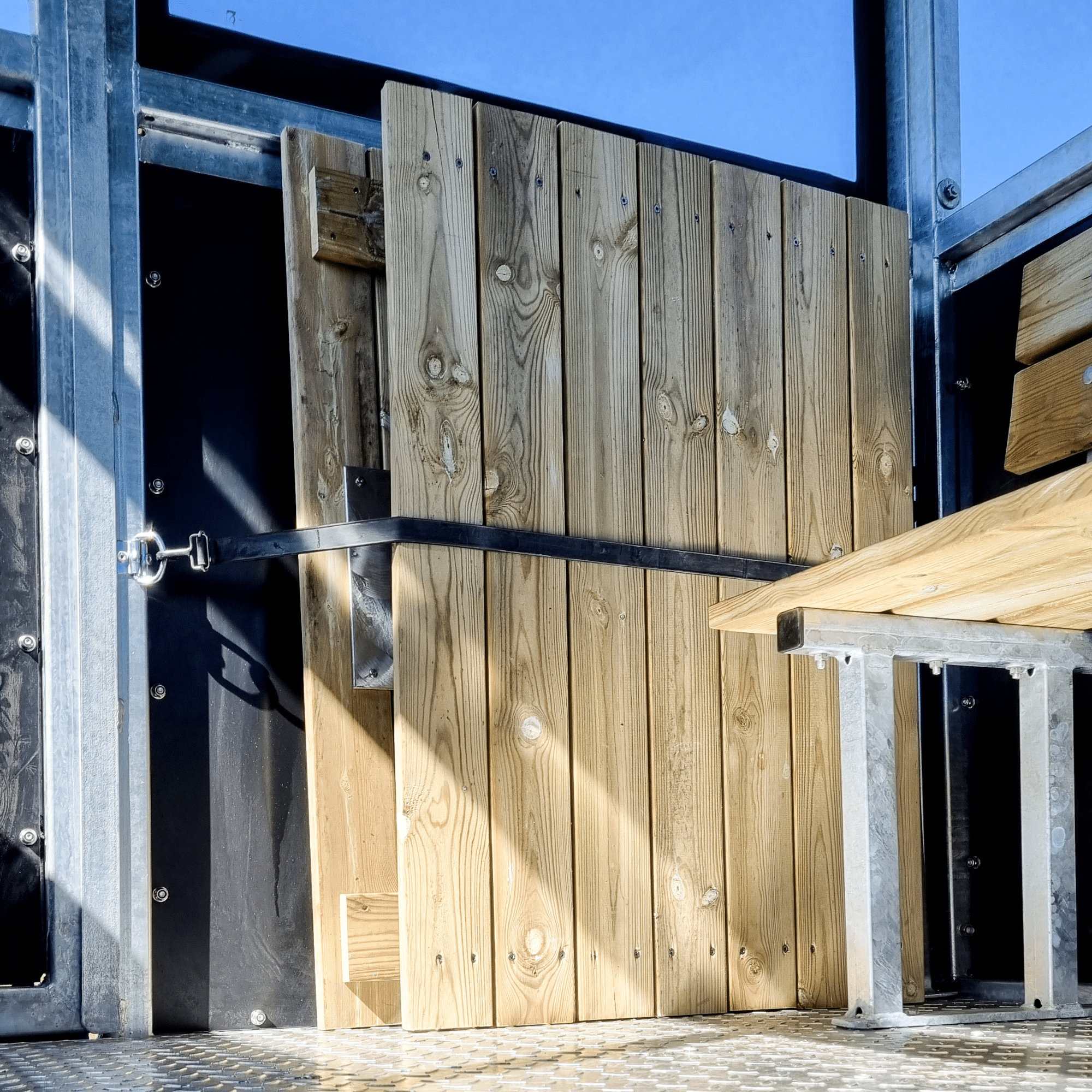 For hunting enthusiasts, the trailer can be equipped with an elegant gun storage holder with capacity for up to 23 rifles. The gun storage holder is made from the same materials as the benches, creating a consistent and stylish appearance. The wooden detailing on the gun storage holder adds an extra touch of luxury, while remaining practical and functional.