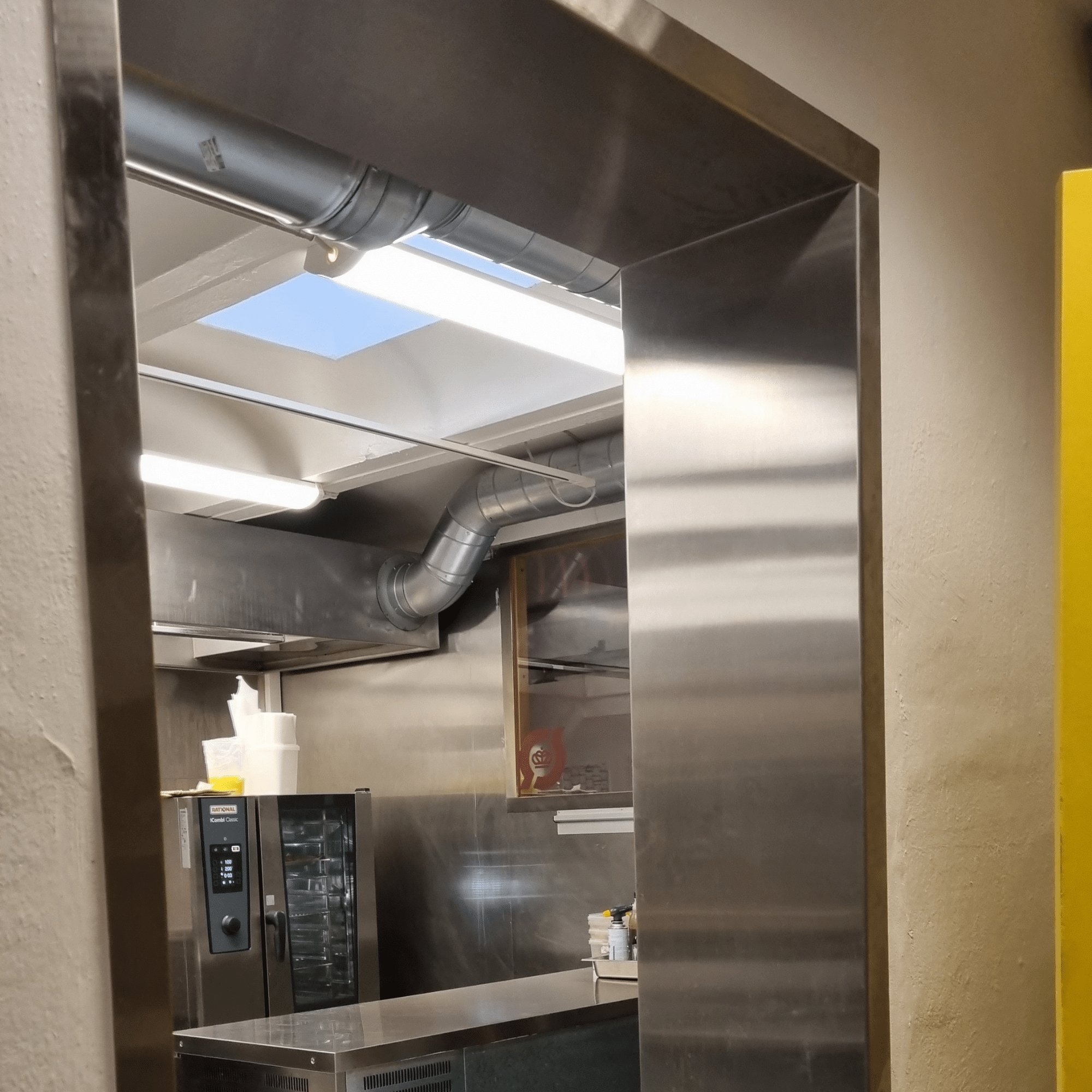 Rustfri stålinddækninger til døre, karme og vægge er skræddersyet efter den enkelte kundes køkken og behov. De har en ikke-porøs overflade, er nemme at rengøre og modstandsdygtige over for korrosion, stød, slag og daglig slitage – ideelle til krævende industrikøkkener.