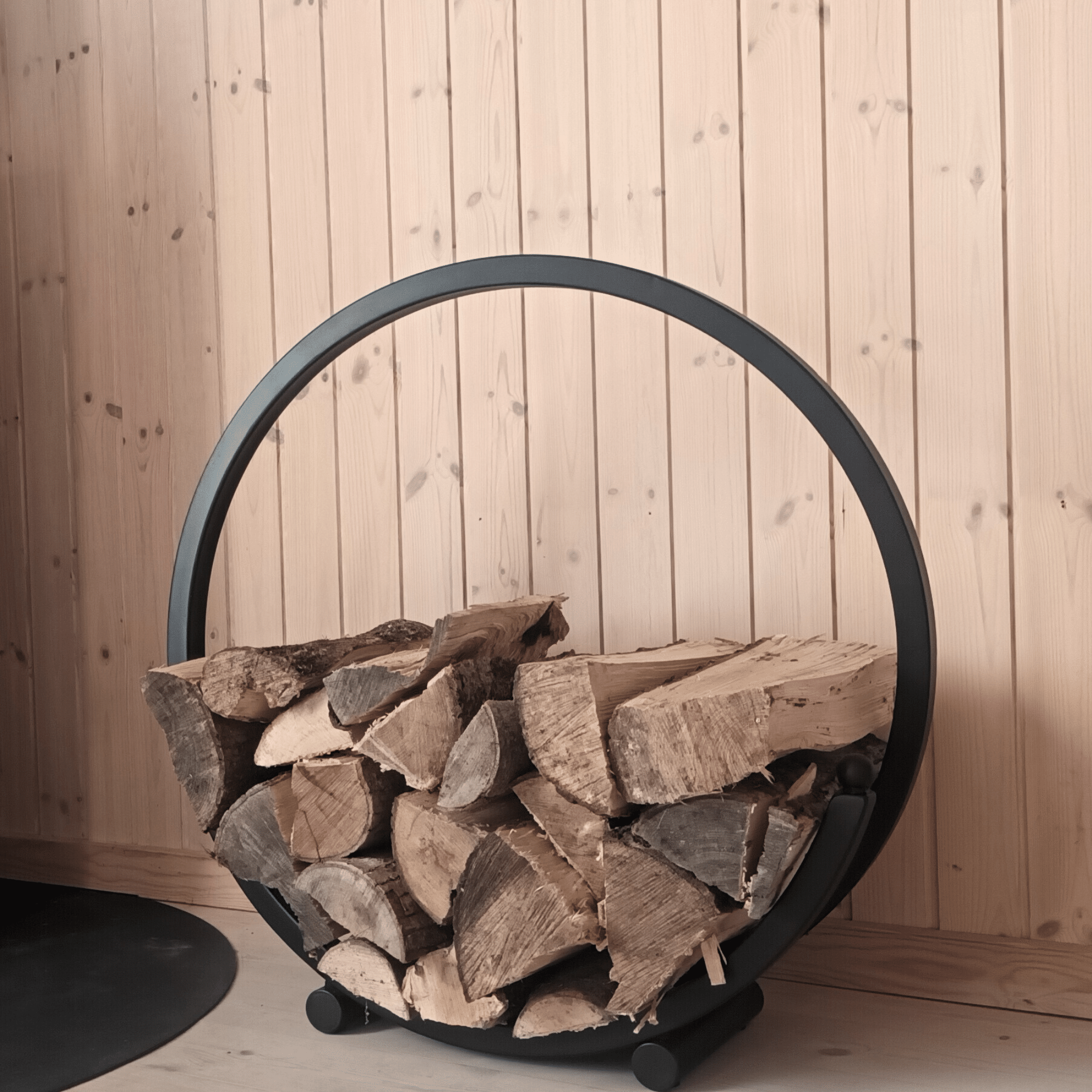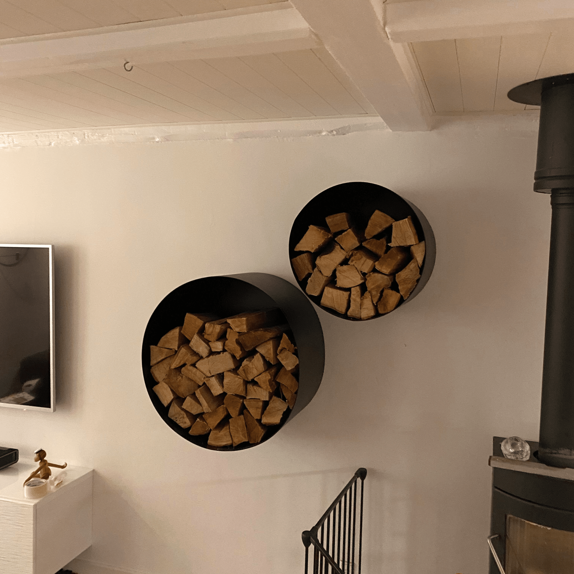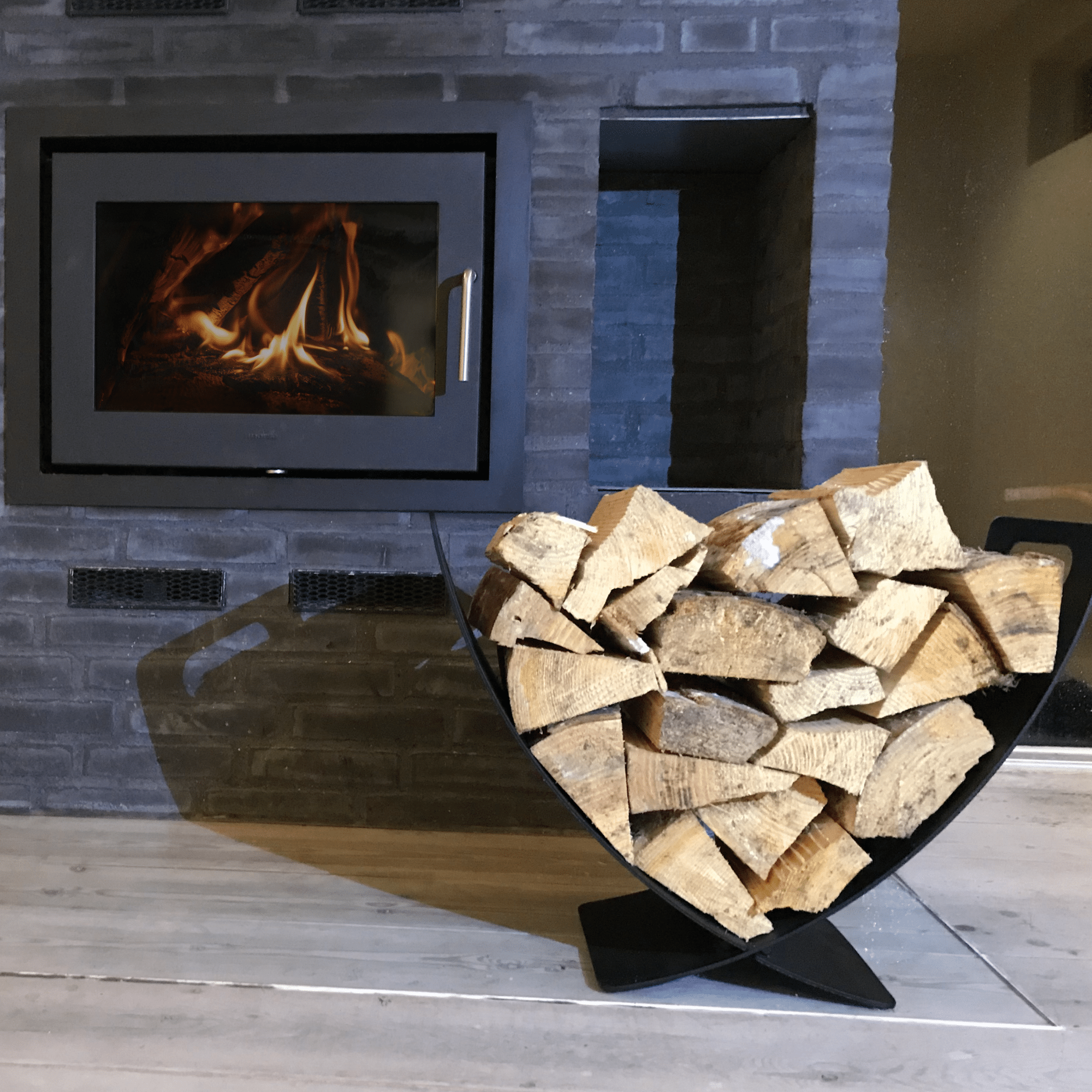 Billederne viser forskellige brændeholdere – nogle til væggen og andre til gulvet – hvor hvert enkelt produkt er nøje tilpasset efter kundernes egne ønsker og design. Den sorte pulverlakering giver en stærk, slidstærk overflade og et flot, ensartet udtryk. Hver holder forener funktionalitet med personlig stil og gennemført håndværk, og tilfører samtidig varme og karakter til hjemmet.