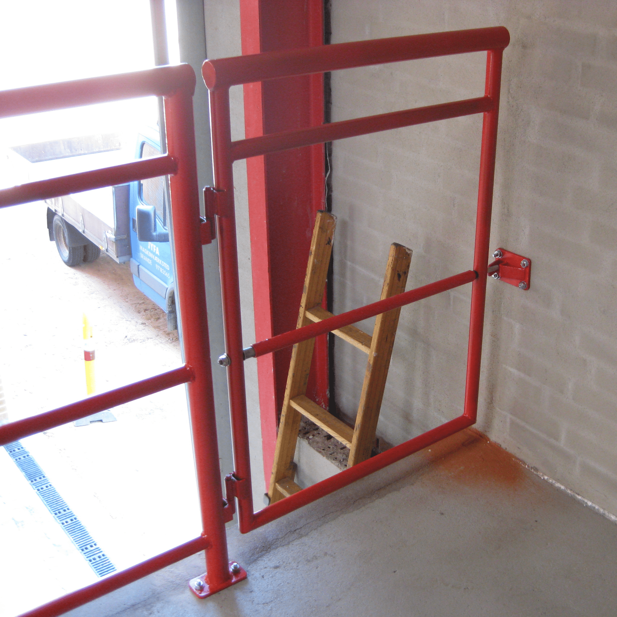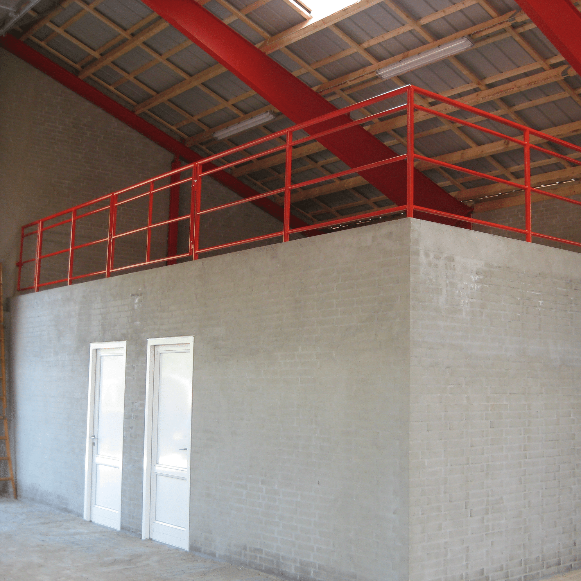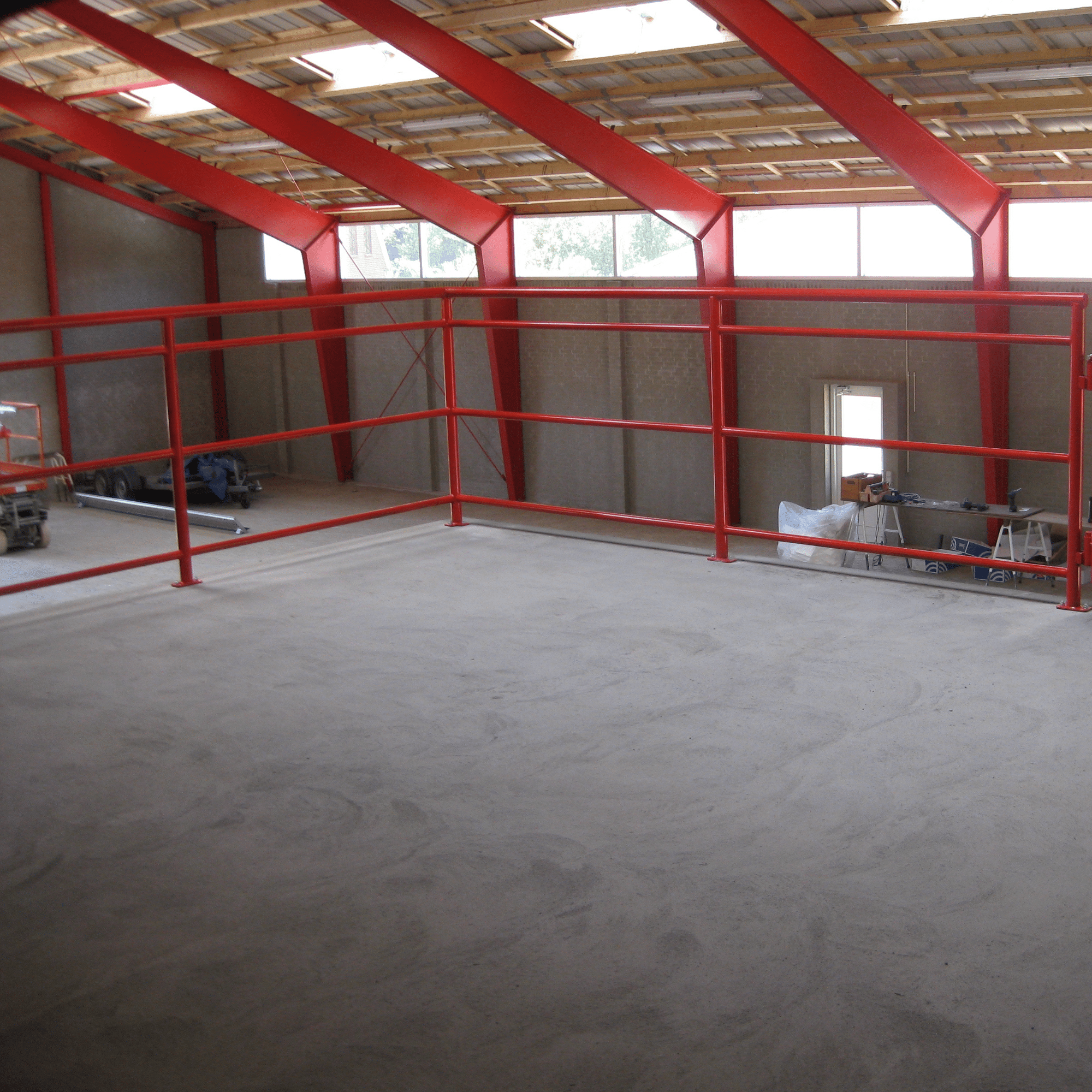 Gelænder, med integrerede låger og afskærmninger. Pulverlakeret i rød, for at matche eksisterende spær. Pulverlakeringen giver en meget slidstærk overflade og flot finish.