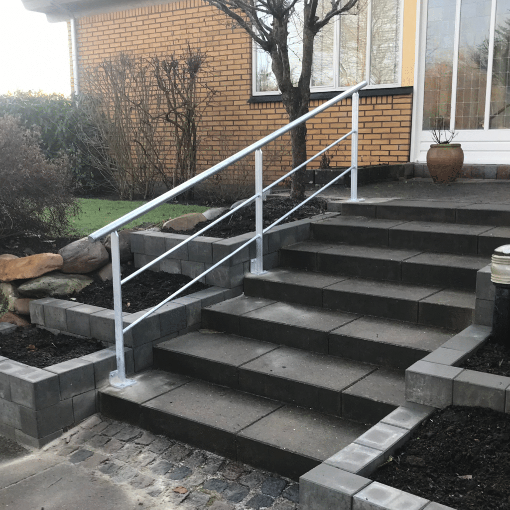 Denne kunde var blevet lidt dårligt gående og manglede noget at støtte sig til op af sin nye flotte trappe. Enkelt løsning med et galvaniseret rækværk med håndliste i rustfri rør.