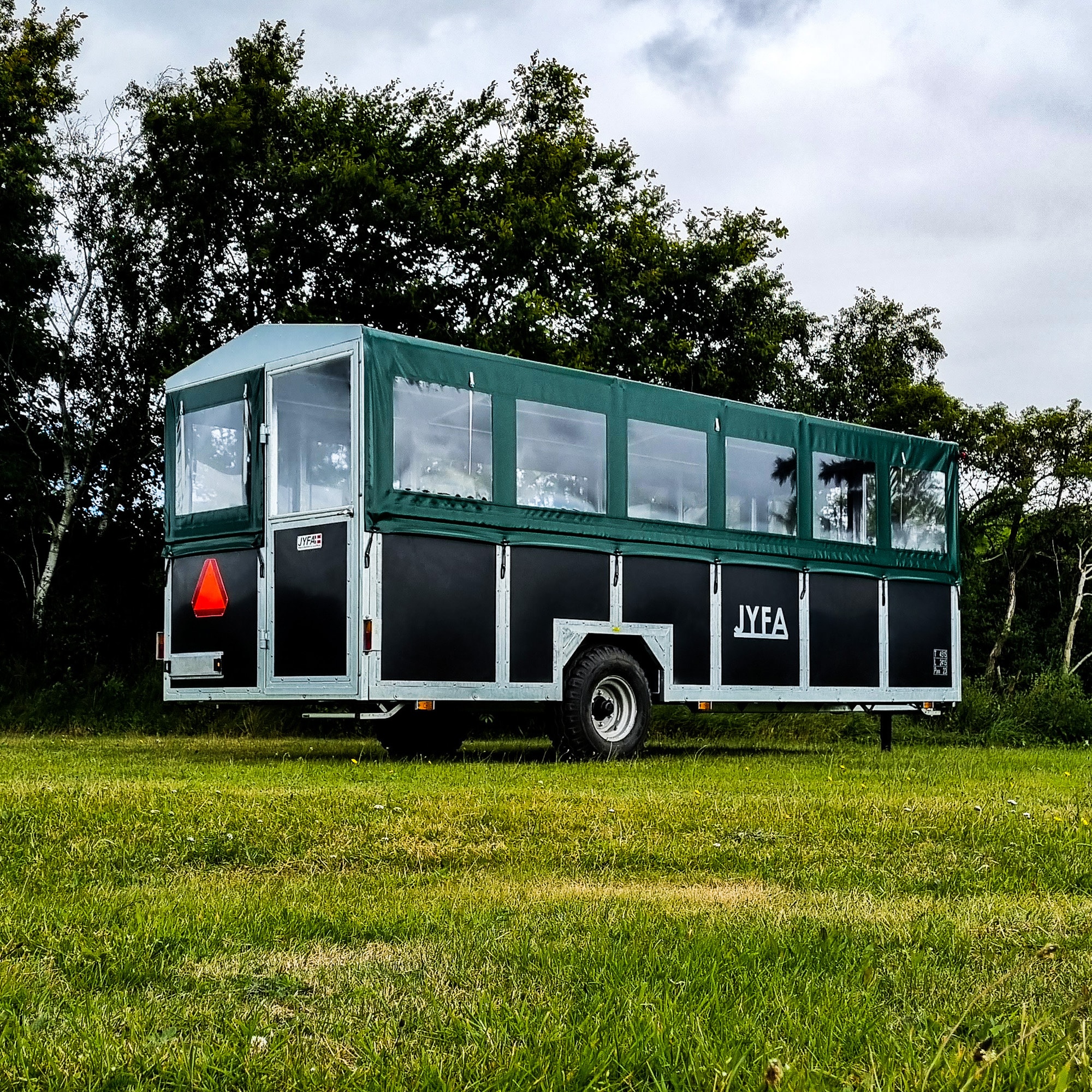 Vognen er monteret med en dør i både bagenden, samt i fronten. Tag og sider er udstyret med grøn presenning, så vognen falder naturligt ind i omgivelserne. Presenningen er oven i købet designet med gennemsigtige plastvinduer på alle sider, så passagererne kan kikke ud, og nyde omgivelserne under turen. Vognen er på hver langside udstyret med oprullelige sider, så du kan rulle en eller begge sider op adskilt. Du kan ligeledes vælge at oprulle fronten og bagenden, og derved skabe en god luftgennemstrømning i vognen under kørsel.