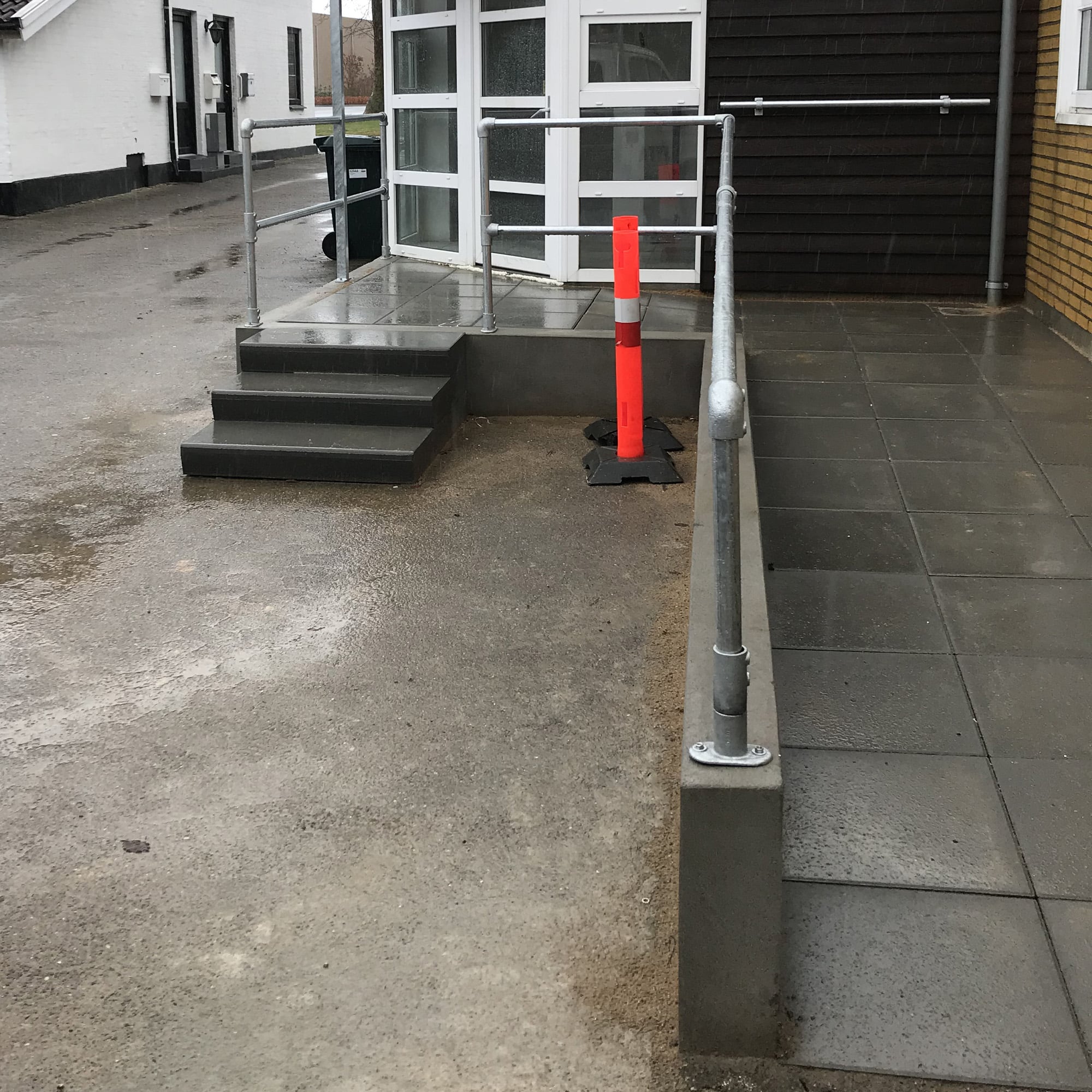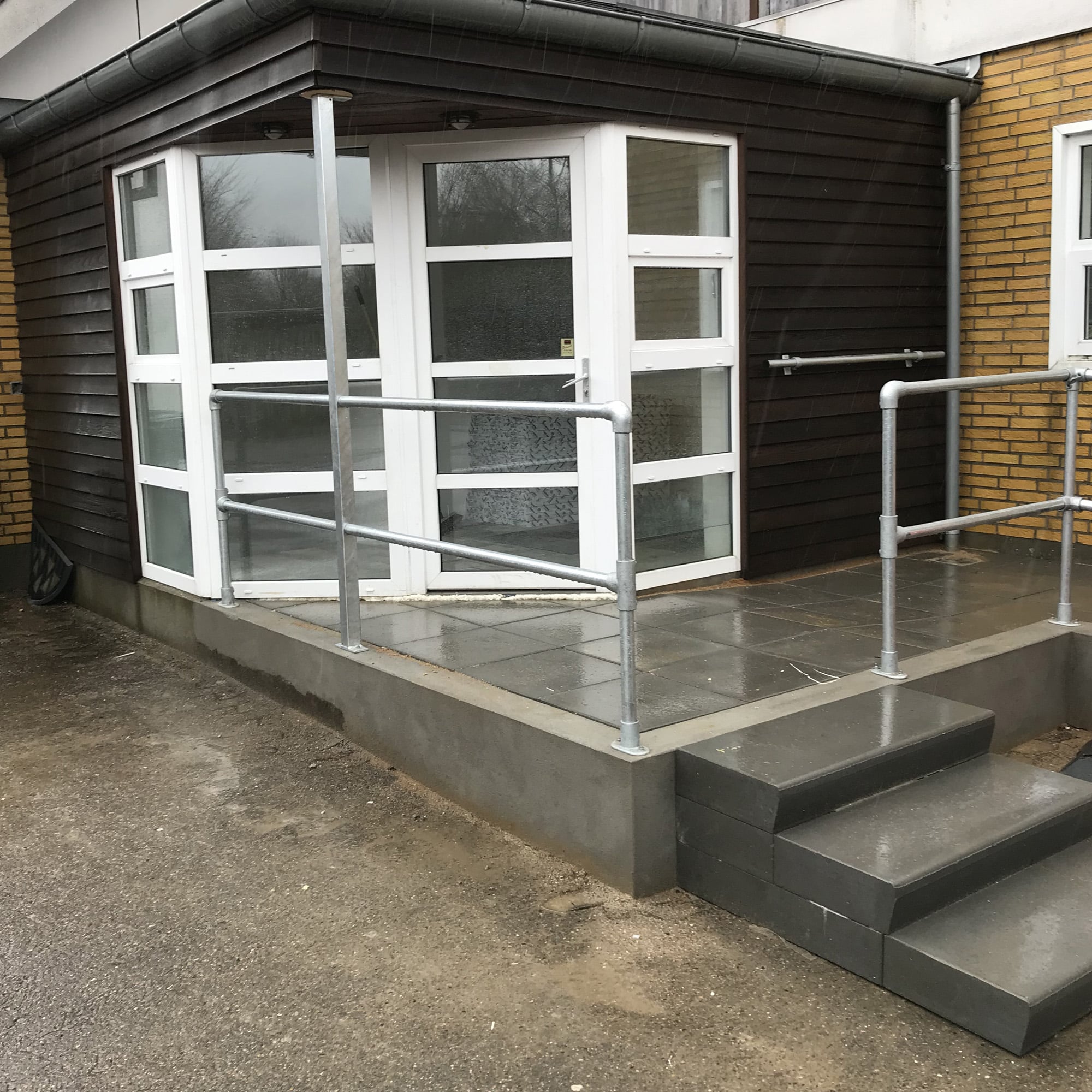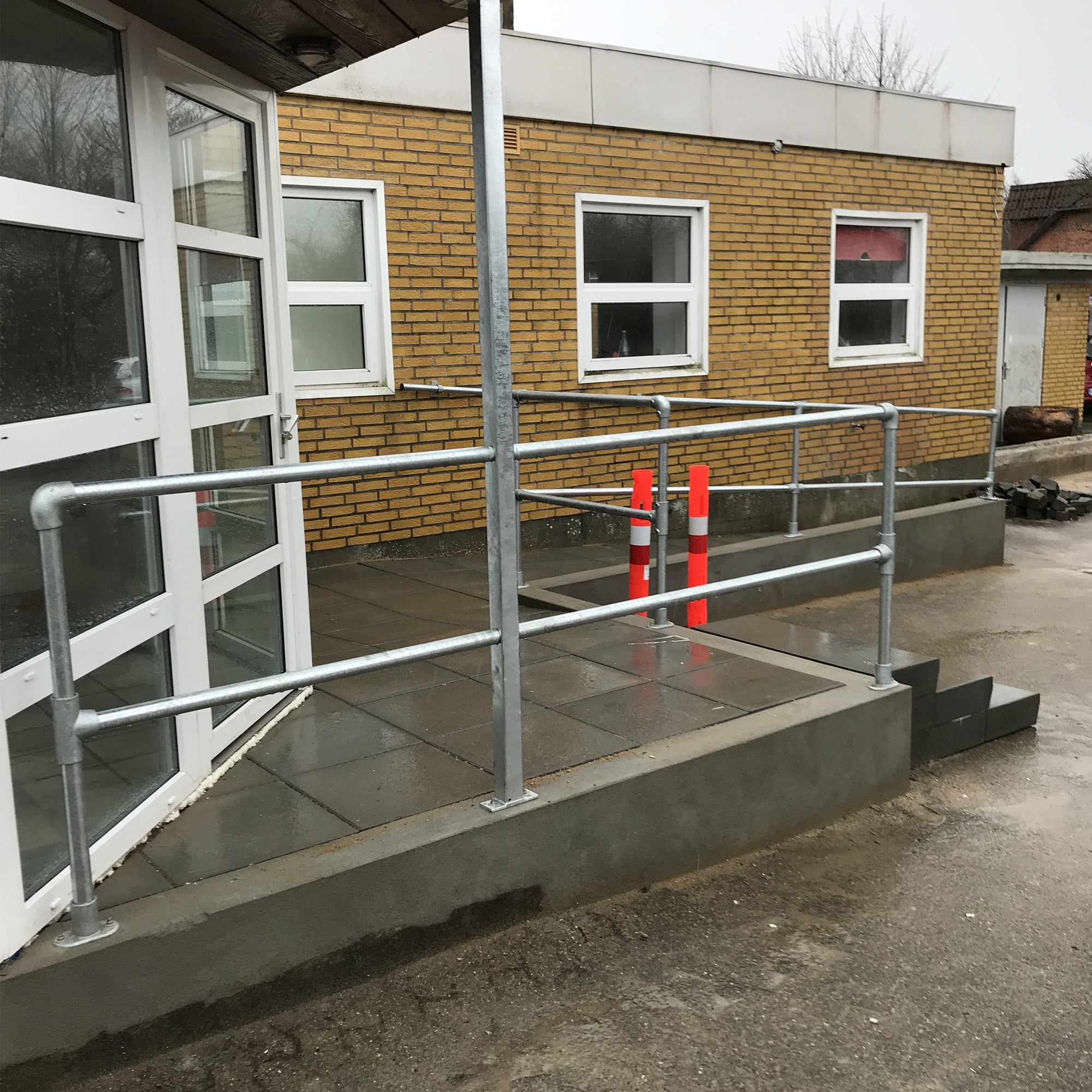 Super lækkert rækværk i 1½” galvaniseret rør med clamp fittings.