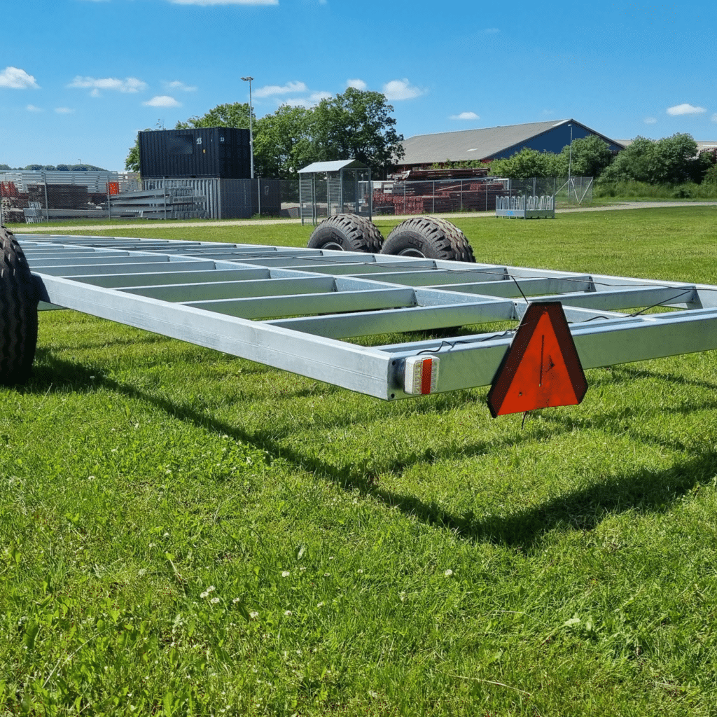 Undervognen er udstyret med hjul, et aftageligt træk og støtteben, så den kan flyttes nemt og sikkert. Den er fuldt galvaniseret, hvilket sikrer robusthed, lang holdbarhed og modstand mod vejr og vind – en fleksibel og praktisk løsning til kundens projekt.