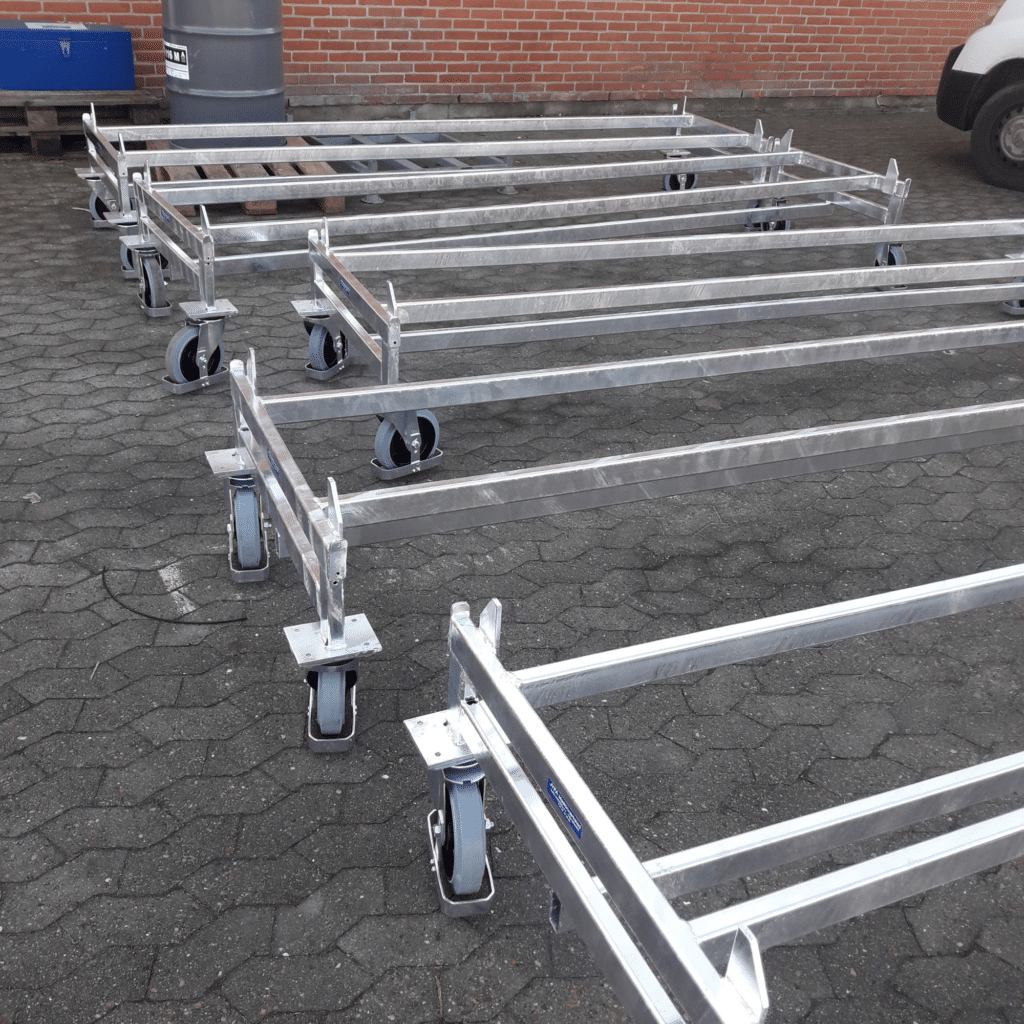 Alle vogne er fuldt galvaniserede og udstyret med stærke hjul, der kan bære stativernes vægt, så løsningen både er robust, holdbar og praktisk i hverdagen.