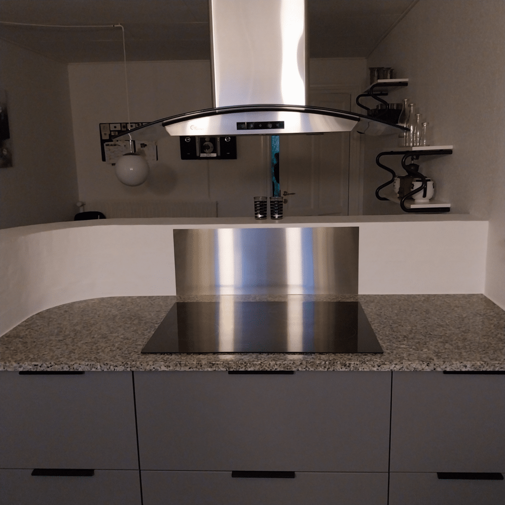 Denne stænkplade er en super praktisk og stilren løsning til køkkenvæggen. Fremstillet i rustfrit, blank stål og speciallavet efter kundens mål, sikrer den både effektiv beskyttelse og et eksklusivt udtryk.