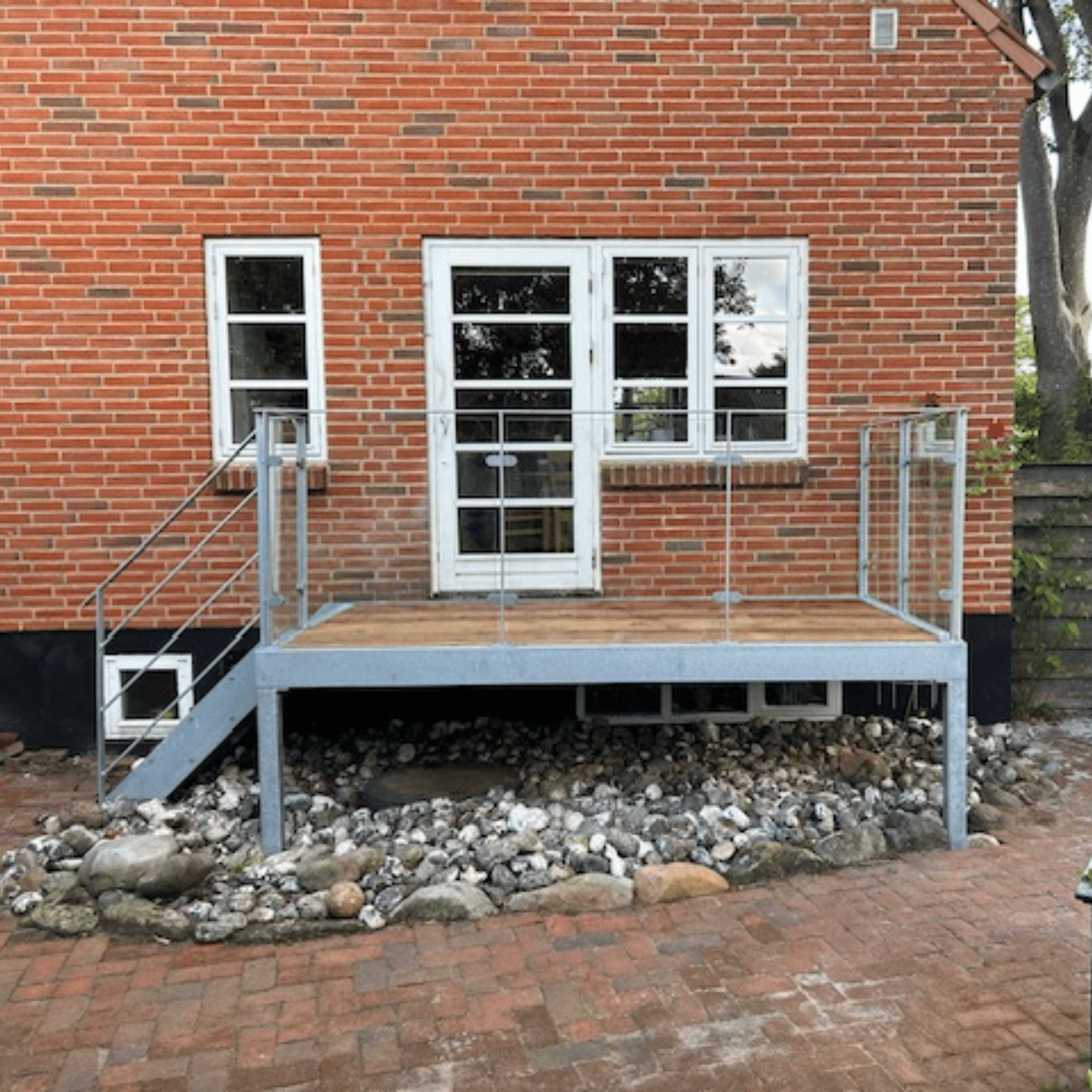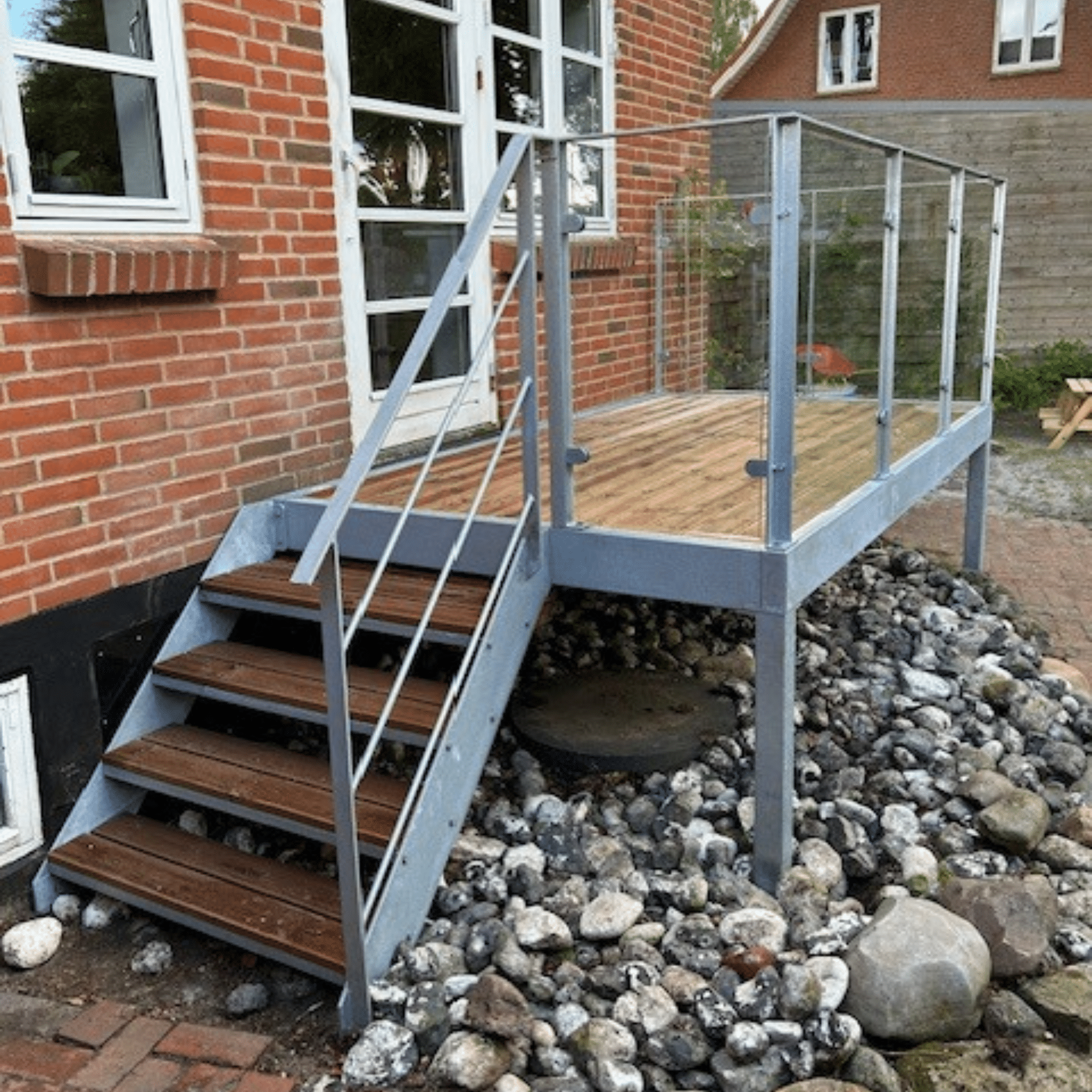 Galvaniseret trappe med glasværn for en vedligeholdelsesfri terrasse med lidt mere plads.